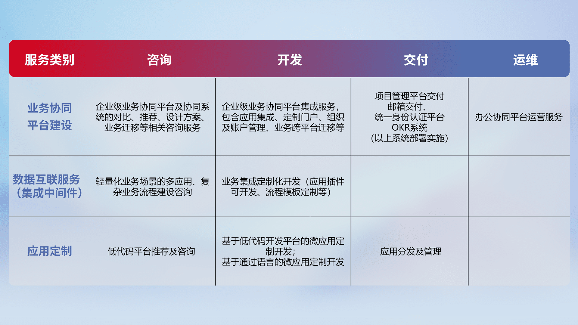 针对钉钉、、企微、、IDaas等平台级产品提供产品的规划、、方案、、、交付、、、定制化开发等服务,,实现如统一协同办公、、智能客户服务、、、混合会议管理、、智能数据查询、、等业务场景,,实现数字化转型。。。